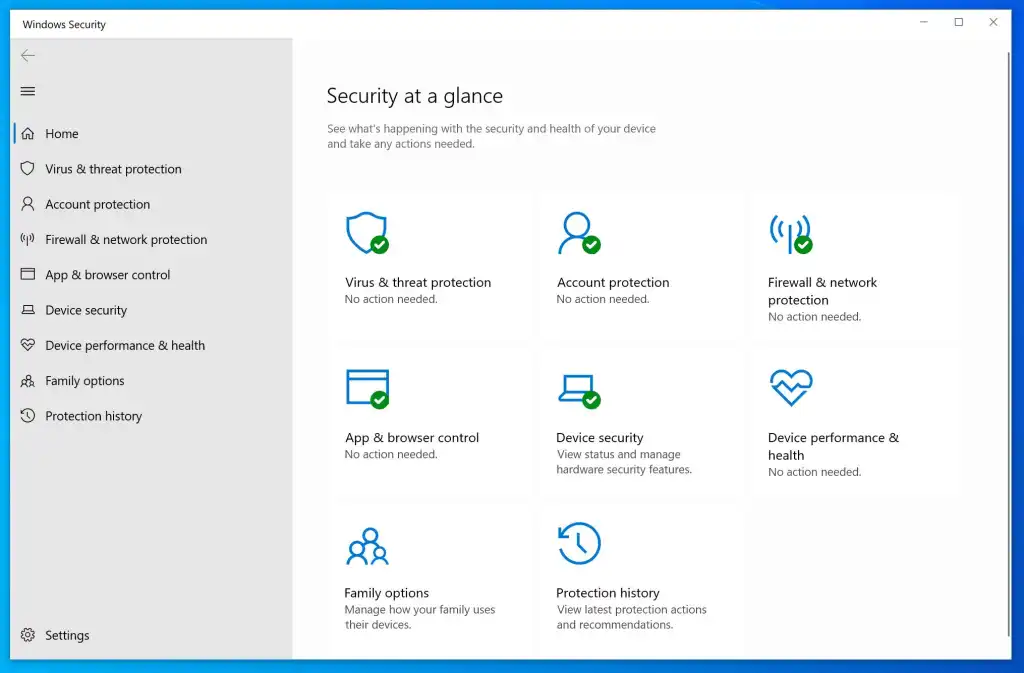 → เมื่อเข้าสู่หน้าหลักของ Windows Security ให้ตรวจสอบหัวข้อหลักต่าง ๆ ดังนี้: